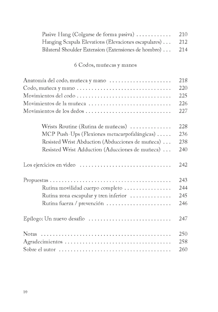 También, ofrece un protocolo integral de ejercicios de movilidad y fuerza de las principales articulaciones: · Pies · Rodillas · Caderas · Columna vertebral · Hombros y escápulas · Codos, muñecas y manos
